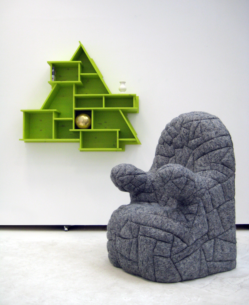 | An item of furniture for intensive storage and retrieval of memories Shelf: lacquer-stained pine of varying sheet widths, (height 145cm) Chair: form-sewn and upholstered ’dog’s rug’ over a polyester shell, (height 140cm) Shown at SE, Snedkernes Efterårsudstilling, 2007 Photo: Ole Jensen |